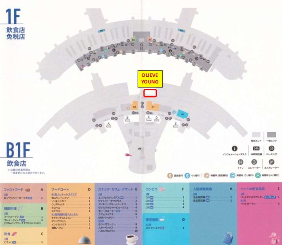 B1Fに、お土産で大人気の「OLIVE YOUNG(オリーブヤング)」があることを確認できました!場所の紹介もさせていただきます!