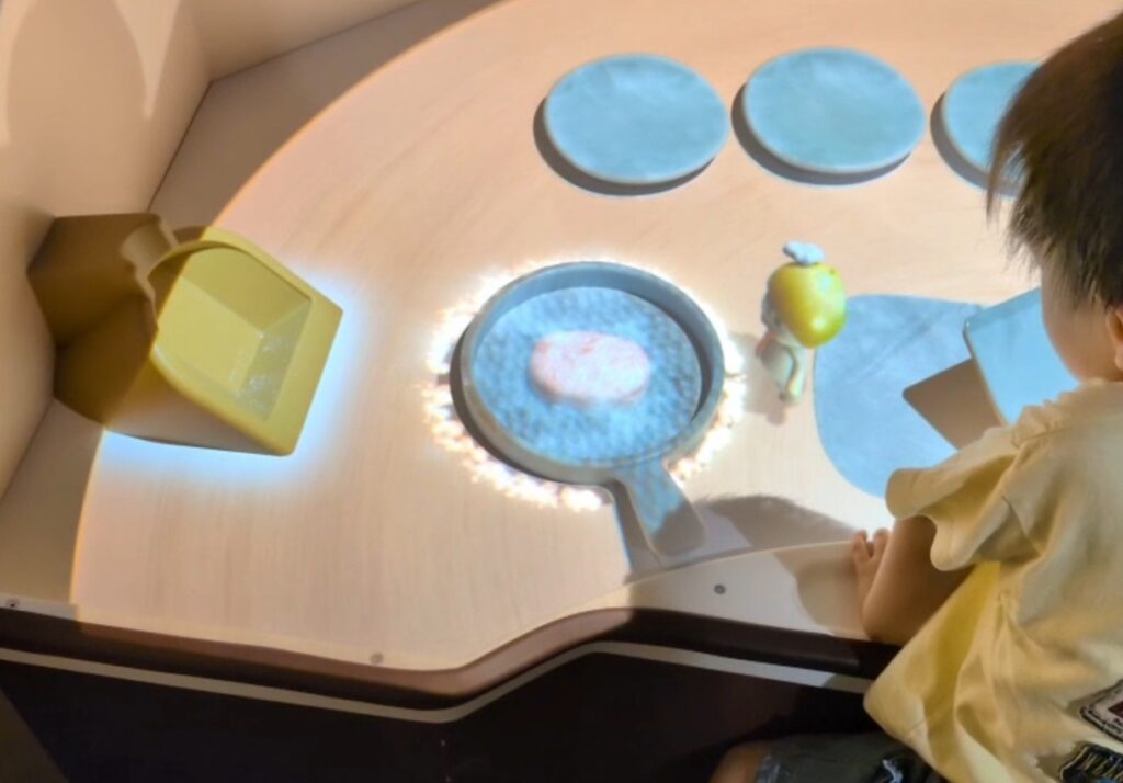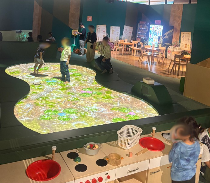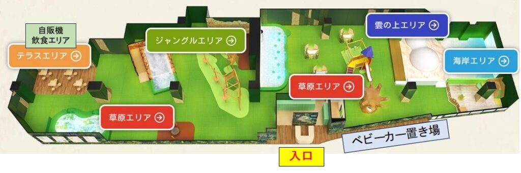 | 草原エリア | はらぺこキッチン(CGままごと)、ケロケロ池(CG池遊び)、 きのこツリーハウス(遊具/滑り台)、どんぐりのブランコ、ちいさなひろば(6~18か月エリア) |